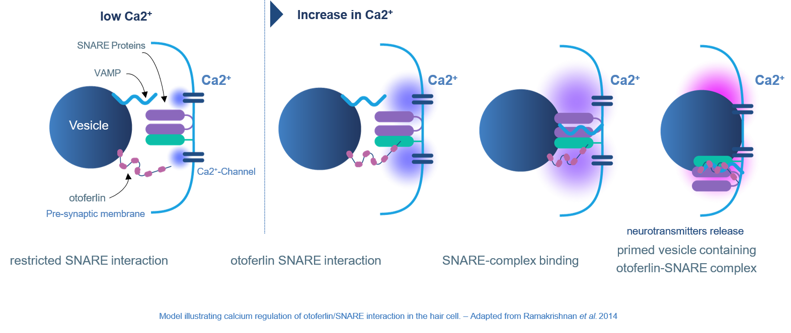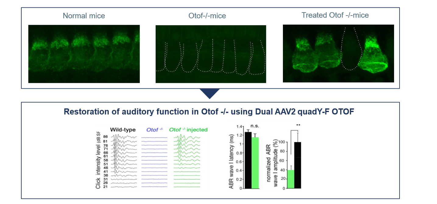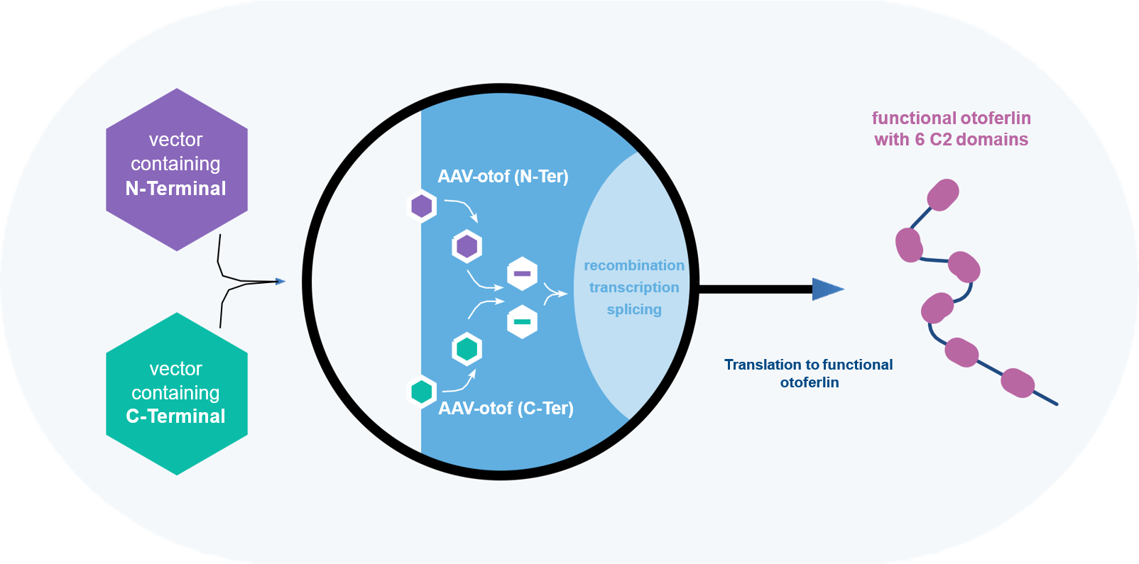This dual gene therapy approach has been proved in concept in preclinical studies: the two parts of the Otoferlin gene were successfully delivered in mice, the protein reassembled and hearing restored