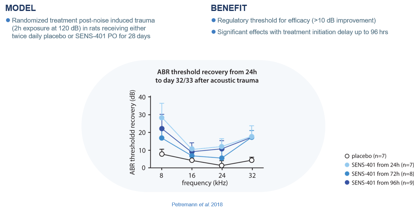 SENS-401 is a first-in-class drug candidate to treat Sudden Sensorineural Hearing Loss (SSNHL). It is aiming at treating or protecting against inner ear lesions that lead to nerve degeneration and sensory hair cell loss. It is protected by a solid intellectual property with two patent families.