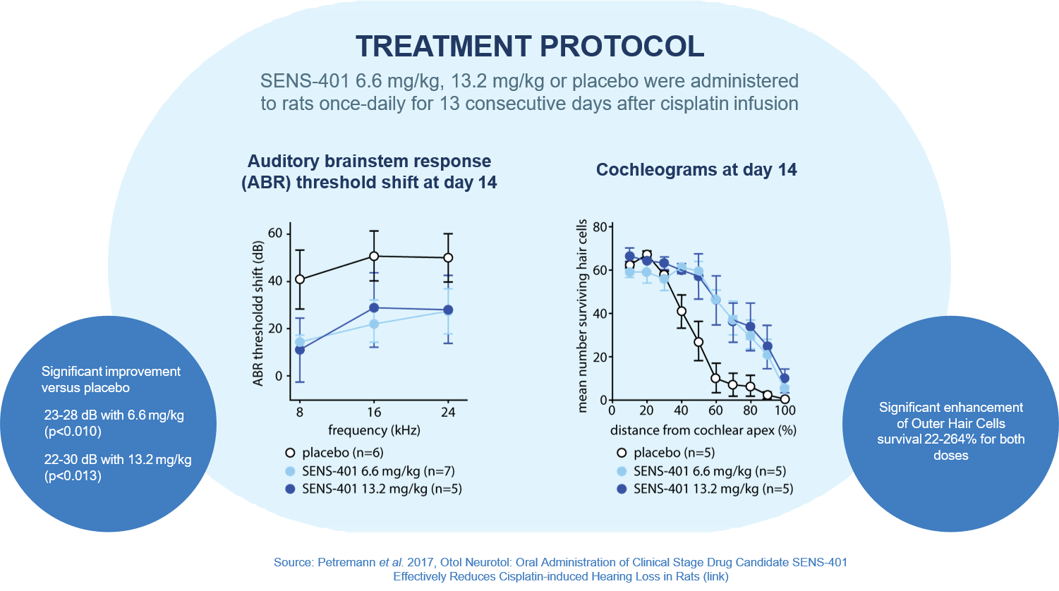 We are developing SENS-401 in the prevention of hearing loss due to Cisplatin-Induced Ototoxicity.