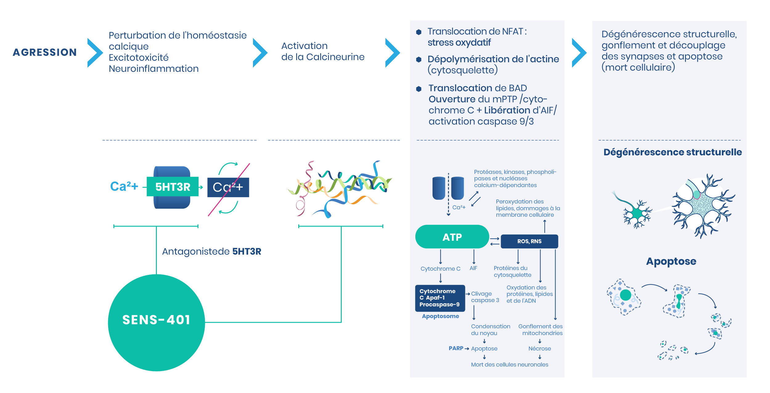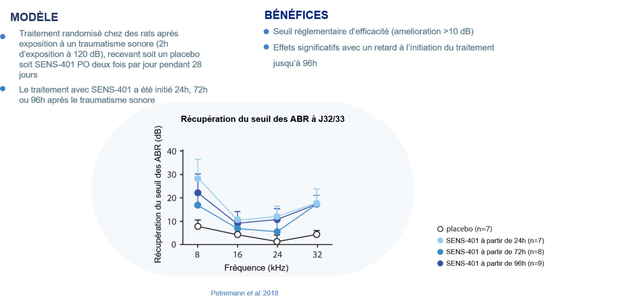 SENS-401 est un candidat médicament first-in-class pour le traitement de la perte auditive. Il permet de traiter ou de prévenir les lésions de l’oreille interne qui conduisent à une dégénérescence nerveuse et une perte de cellules ciliées sensorielles. Il bénéficie d’une propriété intellectuelle solide avec deux familles de brevets.