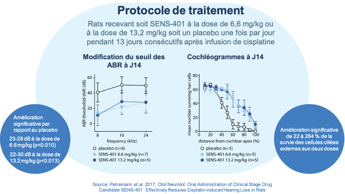 Nous avons annoncé des données précliniques encourageantes qui démontrent le potentiel de SENS-401 dans la préservation de l’audition résiduelle après implantation cochléaire. Suite à ce premier succès, nous lançons une étude clinique de Phase 2a avec notre partenaire Cochlear LTD.